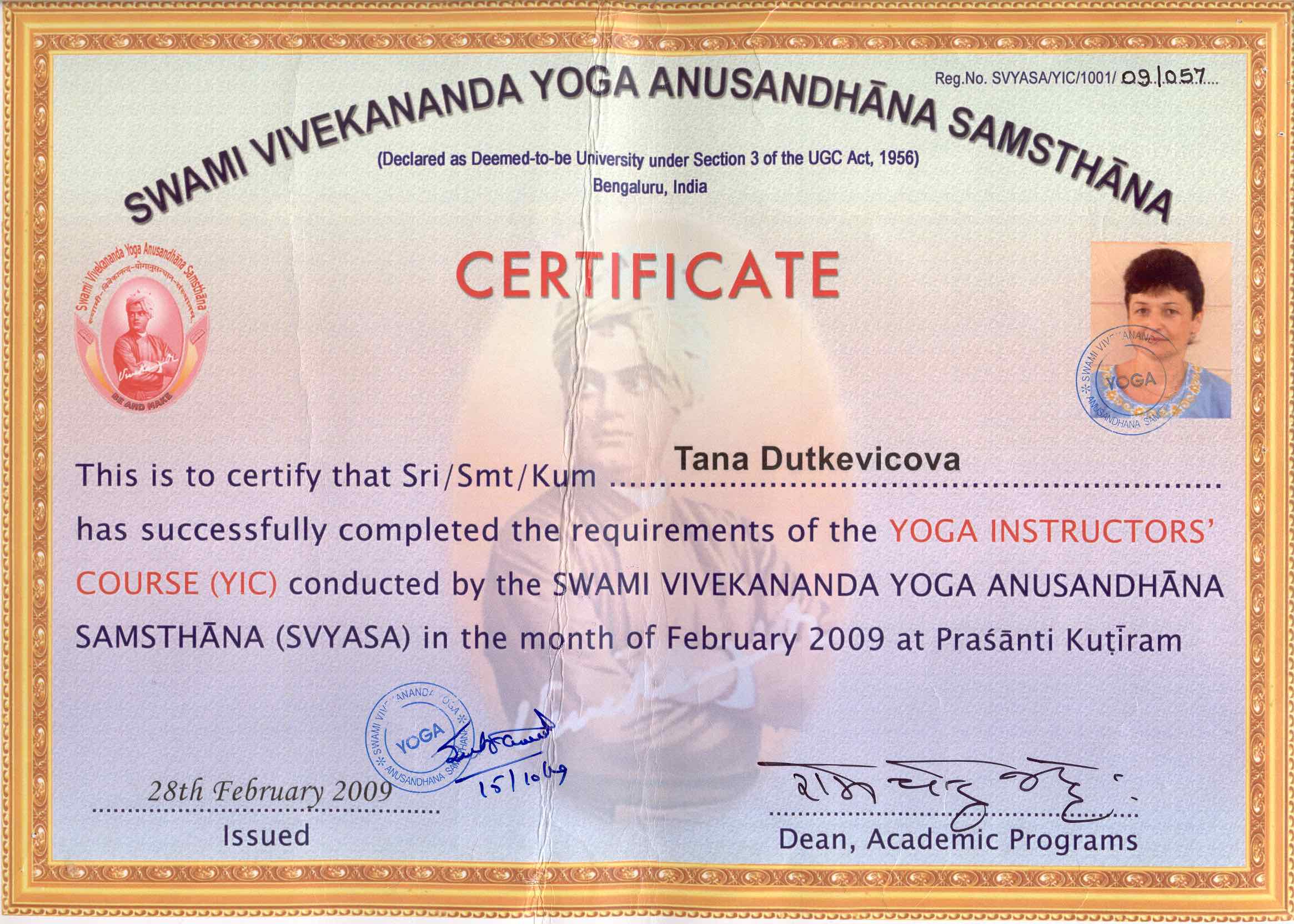 Po nešťastném úmrtí naší německé lektorky jógy v březnu 2008 jsem převzala vedení mezinárodní skupiny a pokračovala v pravidelných cvičeních 2-3x týdně, byť jsem na to neměla patřičné vzdělání a „příslušný papír“. Ale poznala jsem, že mě to baví a že to asi nedělám špatně, neboť cvičenek přibývalo. Logickým vyústěním byl kurz instruktora hathajógy v indickém ášramu. Ten zážitek se těžko popisuje někomu, kdo nikdy nebyl v Indii, nebo aspoň v Asii. Dal by se pro našince trošku přirovnat k pobytu ve vězení. Měsíc v areálu jógové univerzity bez jediné „spřízněné duše“, s pevným rozvrhem od 5h ráno do 22h večer, seznamování se s indickou filozofií, Pataňdžaliho systémem jógy, ranní a večerní zpěvy v sanskrtu, kterému jsme nerozuměli, zprvu vedl nás „západní“ účastníky k velkému neklidu a pocitu ztráty času, které se však s každým dalším dnem měnily ve smíření se se skutečností, v obrovskou úlevu, pokoru a relaxaci.